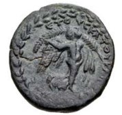 Nike advancing r., wearing chiton and peplos, holding palm in l. hand behind head, and its extremity in r. hand; all within wreath; dotted border.