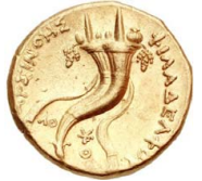 Veiled head of deified Arsinoe II r., with ram's horn, wearing diademed stephane, lotus-tipped scepter over far shoulder; dotted border.