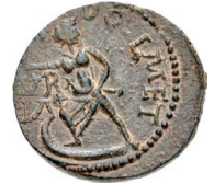 Kadmos standing l. on prow l., head r., extending r. hand, holding himation and parazonium with l.; dotted border.