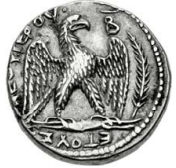 Eagle standing facing on thunderbolt, head r. and tail l., wings spread, palm in r. field; dotted border.