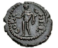Mercury standing facing, head l., holding purse in r. hand and caduceus in l.; dotted border