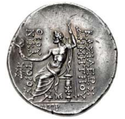 Zeus seated l. on throne, himation over lower part of body, resting l. hand on sceptre and holding on outstretched r. hand Nike extending wreath in r. hand.