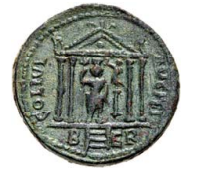 Adyton of temple with four Corinthian columns, three steps and pediment ornamented with disc in the middle and acroteria on angles and top; between the columns, Tyche standing facing, turreted, l. foot on prow, resting with r. hand on stylis and with l. raising skirt to l. knee; on r., Nike standing l. on small column crowning her, dotted border.