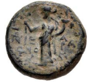 Turreted Tyche standing l., holding cornucopiae in l. hand and aphlaston in extended r.; dotted border.