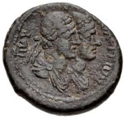 Busts, draped, of Dioscuri, jugate, r., wearing laureate caps surmounted by stars; dotted border.