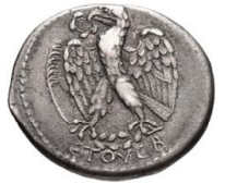 Eagle standing l. on two opposed laurel branches, wings open, wreath in beak, palm to l.; dotted border.