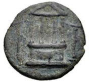 Altar before tetrastyle temple on high podium, with scroll ornament in pediment; isolated column to either side.