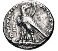 Eagle standing l. on thunderbolt, head r., wings closed, double corncucopiae bound with royal diadem over shoulder