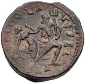 Laureate bust of Elagabalus r., wearing cuirass and paludamentum; dotted border.