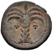 Palm tree with two bunches of fruit; dotted border.