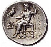 Zeus seated l. on throne, himation over lower part of body, holding eagle on outstretched r. hand and resting l. hand on sceptre; dotted border.