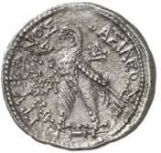 Eagle standing l. with closed wings, on thunderbolt; dotted border.