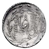 Spiked Macedonian helmet with cheek guards facing l., with wild goat’s horn above visor adorned with laurel branch, medallions containing eagle and panther on helmet bowl; oak wreath border.