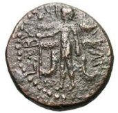 Cronos-El naked, with six wings, standing l., wearing high calathos, holding sceptre in r. hand; dotted border.