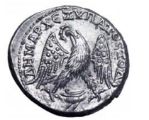 Eagle standing facing, head l., holding wreath in beak, wings spread, prow l. between legs; dotted border.
