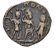 Tyche between the Dioscuri; Tyche is turreted, wearing long chiton, standing r. with l. foot on prow, resting on stylis with r. hand and raising her dress on knee with l.; the Dioscuri, nued, star above head, facing towards her, each resting with one hand on spear, and holding bunch of grapes in other; dotted border.
