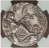 Tyche of Antioch seated r. on rock, holding palm; at her feet, river-god Orontes swimming r.; dotted border.