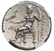 Zeus seated l. on throne, himation over lower part of body, holding eagle on outstretched r. hand and resting l. hand on sceptre.