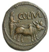 Veiled Founder ploughing to r. with ox and cow; dotted border.