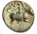 Europa seated to front on bull r., holding his horn with l. hand and inflated veil with r.; dotted border.