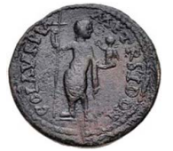Elagabalus standing l., head r., himation over lower body and over l. arm, crowned by Nike standing l. on his extended l. hand; dotted border.