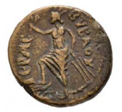 Tyche standing l., turreted, r. foot on prow, chiton raised above r. knee, holding aphlaston in extended r. hand and resting l. on rudder; dotted border.