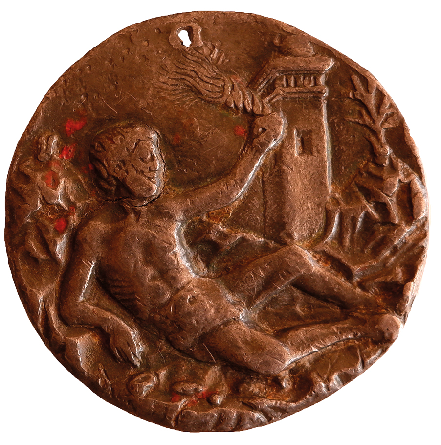 Naked river god reclining on his right hand and holding a torch in a rocky setting, in front of a tower.