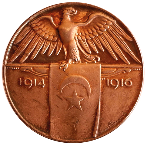 Turkey. Medal by O. Hoppe representing Enver Pasha the Turkish war Minister of the Ottoman sultan Mohammad V. He was Court-Martialed in 1919-1920 for crimes of “plunging the country into war without a legitimate reason, forced deportation of Armenians and leaving the country without permission” and was condemned to death. He Joined Lenin who sent him to suppress the Basmachi Revolt, but defected to their side. He was killed by Russian soldiers during a surprise attack in 1922 AD