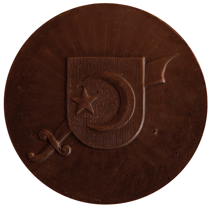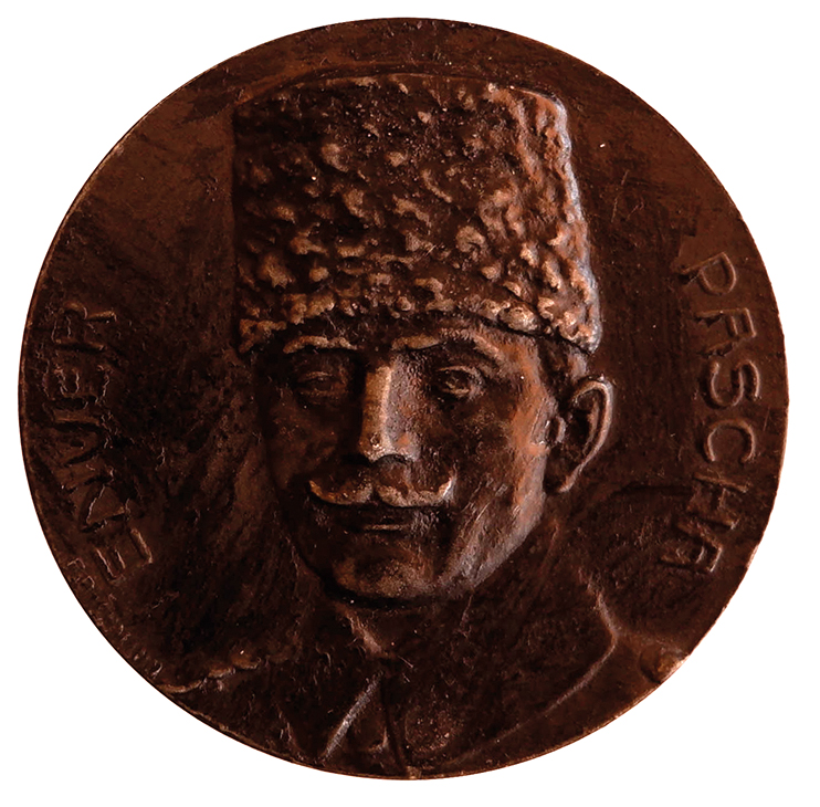 Turkey. Medal by O. Hoppe representing Enver Pasha the Turkish war Minister of the Ottoman sultan Mohammad V. He was Court-Martialed in 1919-1920 for crimes of “plunging the country into war without a legitimate reason, forced deportation of Armenians and leaving the country without permission” and was condemned to death. He Joined Lenin who sent him to suppress the Basmachi Revolt, but defected to their side. He was killed by Russian soldiers during a surprise attack in 1922 AD.
