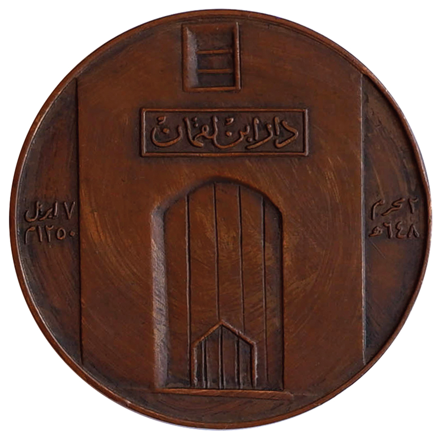 تذكار / انتصار الآباء / على جيوش الصليبيين (to right, commemoration of the Fathers’ victory over the Crusaders), هدية الأبناء الى / الرئيس جمال عبد الناصر / خليفة صلاح الدين (to left, gift of the sons to the president Jamal Abdul Nasser successor of Salah el-Din), المنصورة ٧ مايو ١٩٦٠ (in exergue, al-Mansura 7 May 1960 ), رزق (in inner left field, Rizq)